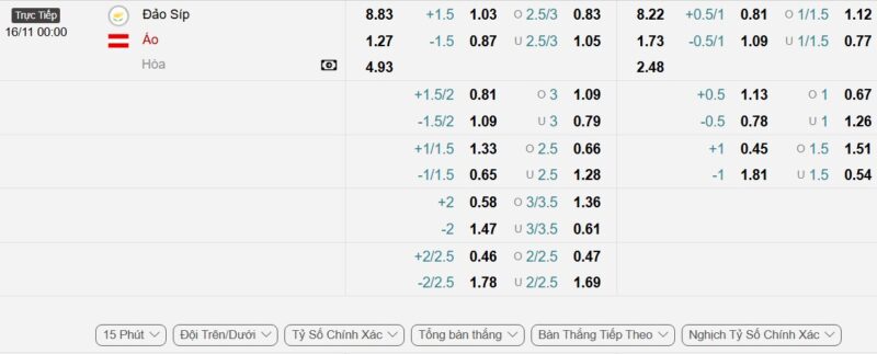 Áo nhiều khả năng sẽ tạo được lợi thế sớm trong hiệp một. Họ thường xuyên tận dụng tốt các khoảng trống và duy trì sức ép liên tục, buộc Đảo Síp phải lùi sâu phòng ngự. Khi đội khách giữ được sự tập trung trong các pha phối hợp và dứt điểm, việc họ tạo được ưu thế ngay trước giờ nghỉ là điều hoàn toàn có cơ sở. Mức kèo tài xỉu mà nhà cái niêm yết là 1.25 với tỷ lệ cho tài là 1.12, tỷ lệ cho xỉu là 0.77, người chơi nên đặt niềm tin vào cửa xỉu cho hiệp đấu này.