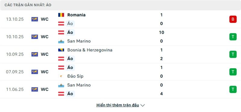 5 trận gần nhất của Áo: L-W-W-W-W
