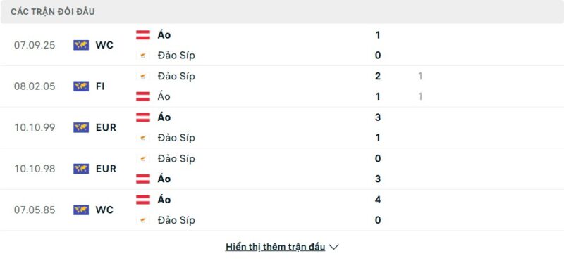 Thành tích đối đầu của Đảo Síp vs Áo