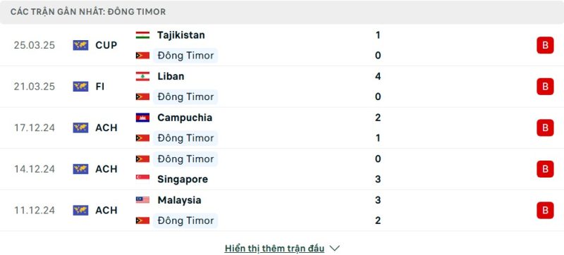 5 trận gần nhất của Đông Timor: L-L-L-L-L