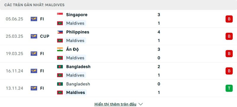 5 trận gần nhất của Maldives: L-L-L-L-W