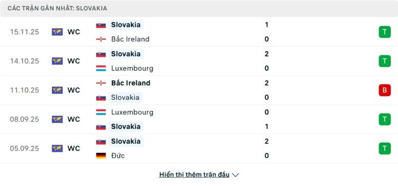 5 trận gần nhất của Slovakia: W-W-L-W-W