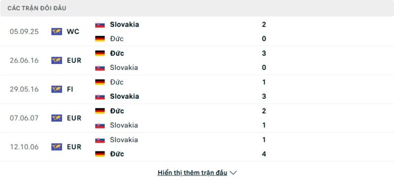 Thành tích đối đầu của Đức vs Slovakia