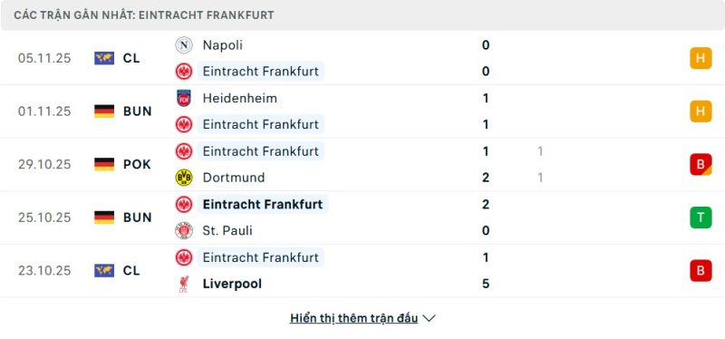 5 trận gần nhất của Eintracht Frankfurt: D-D-D-W-L