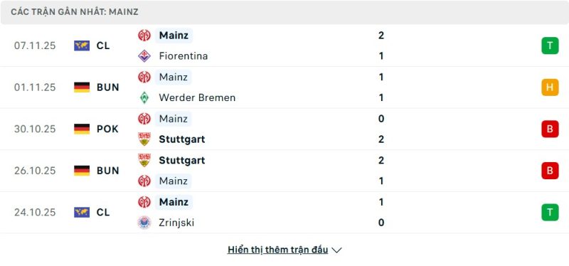 5 trận gần nhất của Mainz 05: W-D-L-L-W