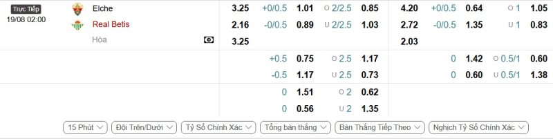 Bảng Tỷ lệ kèo bóng đá Elche vs Real Betis