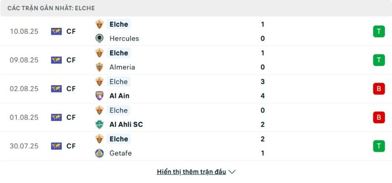 Elche bước vào mùa giải mới với tinh thần hứng khởi sau loạt trận giao hữu khá ổn định. Họ giành chiến thắng trước Hércules và Almería với cùng kịch bản giữ sạch lưới, đồng thời đánh bại Getafe và Millwall. Dù vậy, đội bóng này cũng bộc lộ sự thiếu ổn định khi nhận những thất bại đáng tiếc trước Al-Ain, Al-Ahli và Blackburn. Điểm sáng của Elche nằm ở khả năng kiểm soát trận đấu và tổ chức hàng phòng ngự vững chắc, giúp họ tự tin đón tiếp đối thủ ở vòng mở màn.