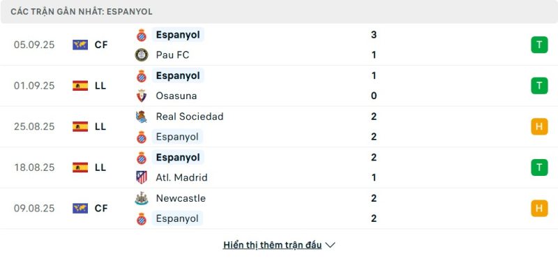 5 trận gần nhất của Espanyol: W-W-D-W-D