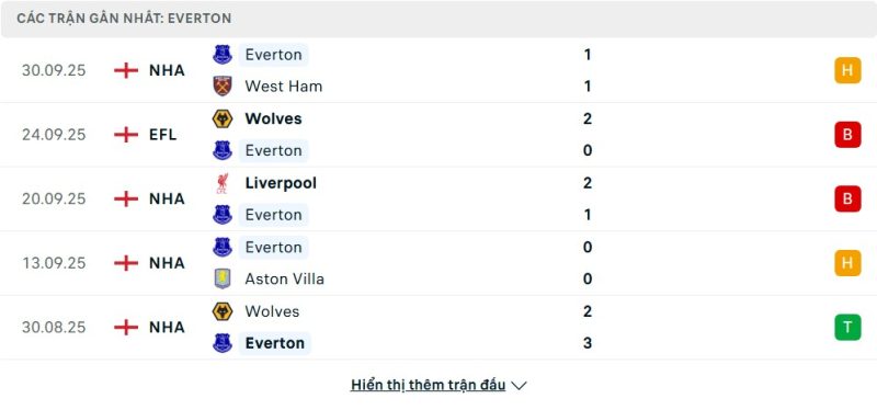 Everton đang có khởi đầu mùa giải tương đối ổn định khi giành được 8 điểm sau 6 vòng đấu và đứng thứ 9 trên bảng xếp hạng. Dưới thời HLV David Moyes, họ có những trận đấu ấn tượng như thắng Wolves 3-2 hay vượt qua Brighton 2-0, nhưng cũng để thua những trận quan trọng trước Liverpool và Wolves. Sự thất thường này khiến Everton chưa thể bứt phá. Dù vậy, với lối chơi kỷ luật, đội bóng vùng Merseyside vẫn duy trì khả năng cạnh tranh nhóm giữa bảng, hứa hẹn gây khó dễ cho bất kỳ đối thủ nào.