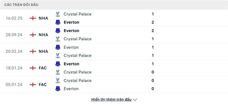 Thành tích đối đầu của Everton vs Crystal Palace