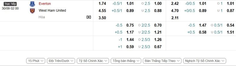 Bảng Tỷ lệ kèo bóng đá Everton vs West Ham United