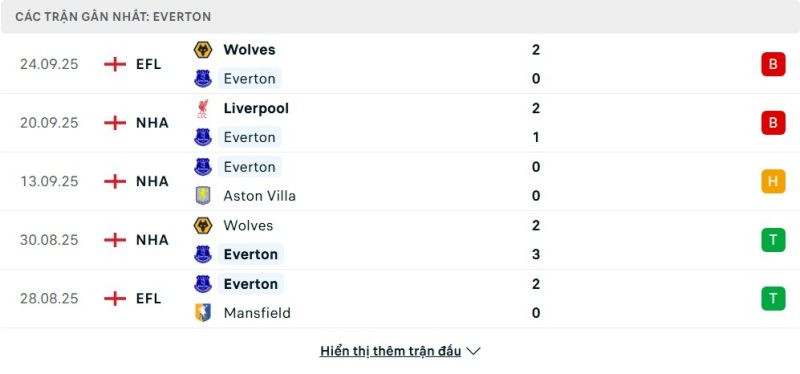 5 trận gần nhất của Everton: L-L-D-W-W