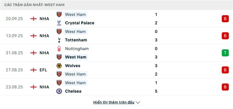 5 trận gần nhất của West Ham United: L-L-W-L-L