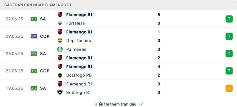 5 trận gần nhất của Flamengo: W-W-W-W-D