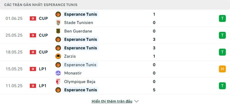 5 trận gần nhất của Espérance Tunis: W-W-W-D-W