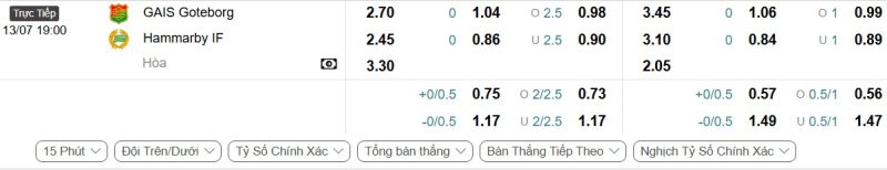 Bảng Tỷ lệ kèo bóng đá GAIS vs Hammarby IF