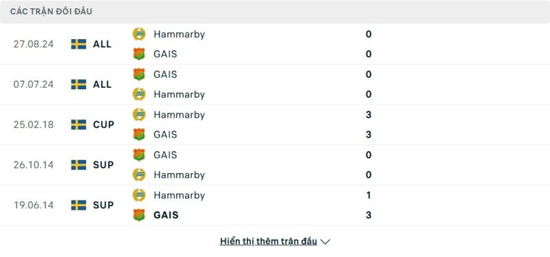 Thành tích đối đầu của GAIS vs Hammarby IF