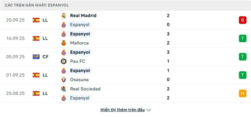 5 trận gần nhất của Espanyol: L-W-W-W-D