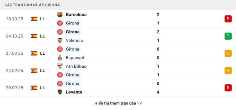 5 trận gần nhất của Girona: L-W-D-D-L