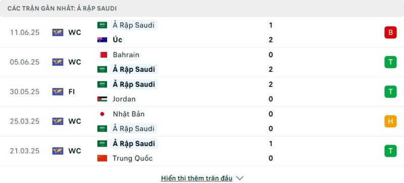 5 trận gần nhất của Ả Rập Xê Út: L-W-W-D-W