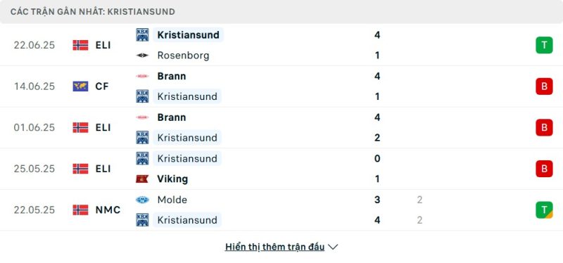 5 trận gần nhất của Kristiansund: W-L-L-L-D