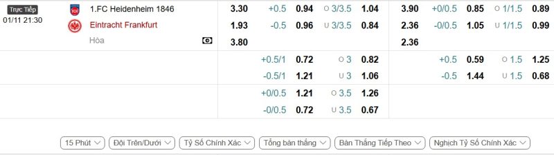 - Kèo tỷ số bóng đá hiệp 1: 1. FC Heidenheim 2-2 Eintracht Frankfurt