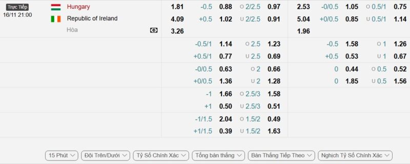 Bảng Tỷ lệ kèo bóng đá Hungary vs Ireland