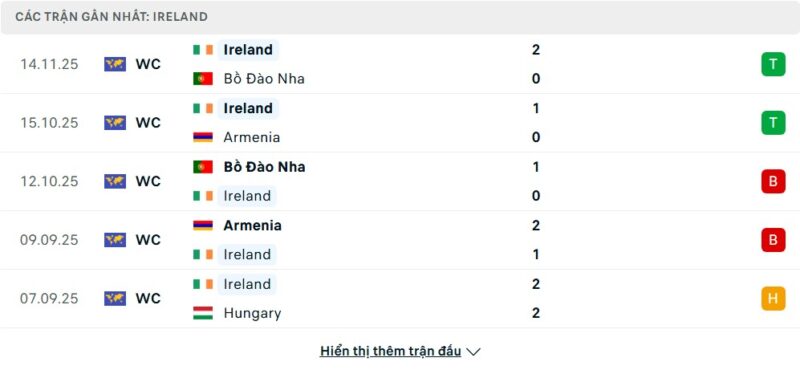 5 trận gần nhất của Ireland: W-W-L-L-D