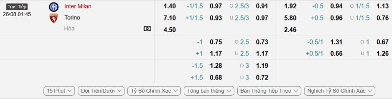 Bảng Tỷ lệ kèo bóng đá Inter Milan vs Torino