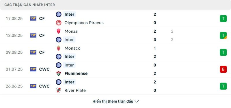 Thống kê phong độ gần đây Inter Milan vs Torino