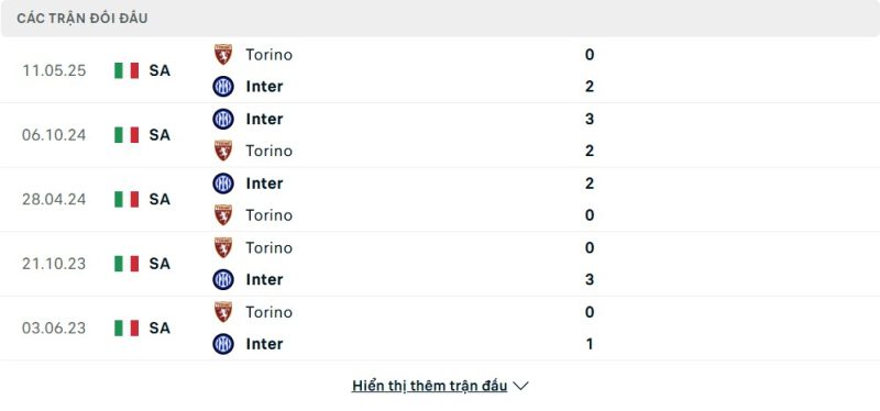 Thành tích đối đầu của Inter Milan vs Torino
