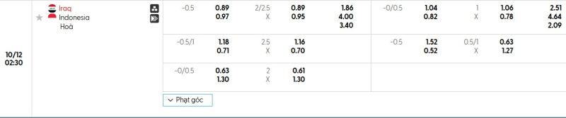Bảng Tỷ lệ kèo bóng đá Iraq vs Indonesia