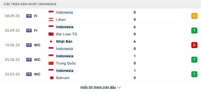 5 trận gần nhất của Indonesia: D-W-L-W-W