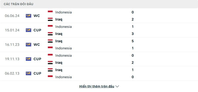 Thành tích đối đầu của Iraq vs Indonesia