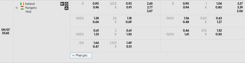 Bảng Tỷ lệ kèo bóng đá Ireland vs Hungary