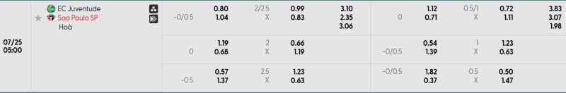 Bảng Tỷ lệ kèo bóng đá Juventude vs São Paulo