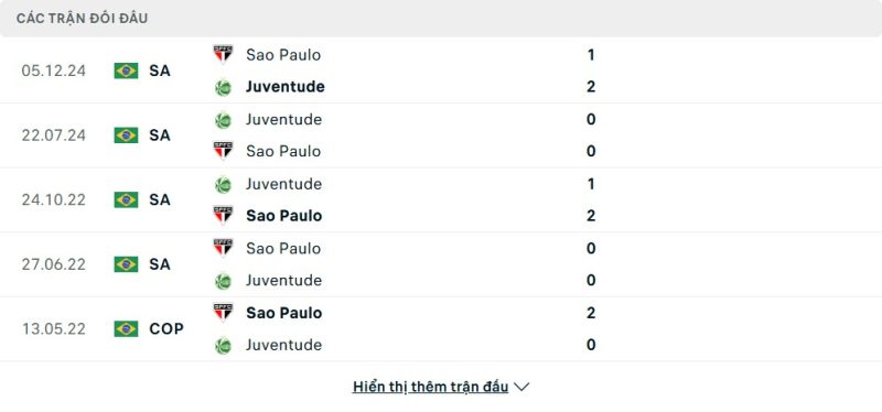 Thành tích đối đầu của Juventude vs São Paulo
