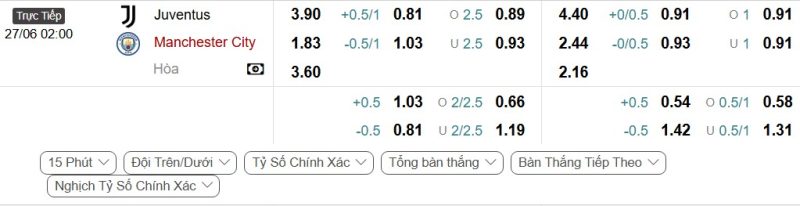 - Kèo tỷ số bóng đá hiệp 1: Juventus 2-0 Manchester City