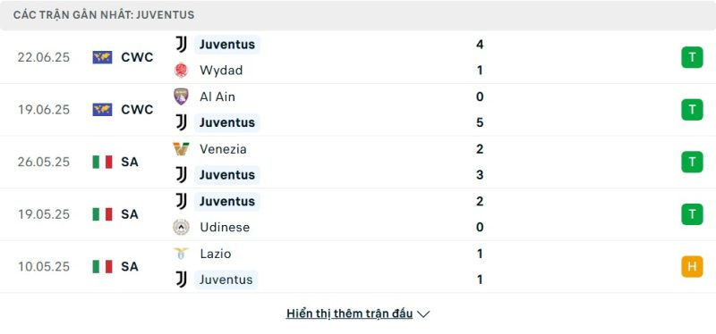5 trận gần nhất của Juventus: W-W-W-W-D