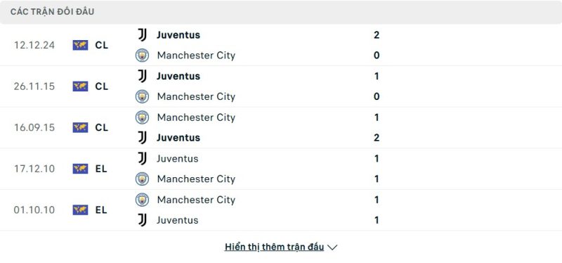 Thành tích đối đầu của Juventus vs Manchester City