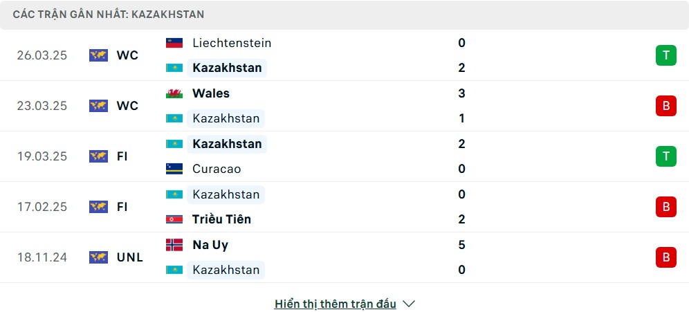 5 trận gần nhất của Kazakhstan: W-L-W-L-L