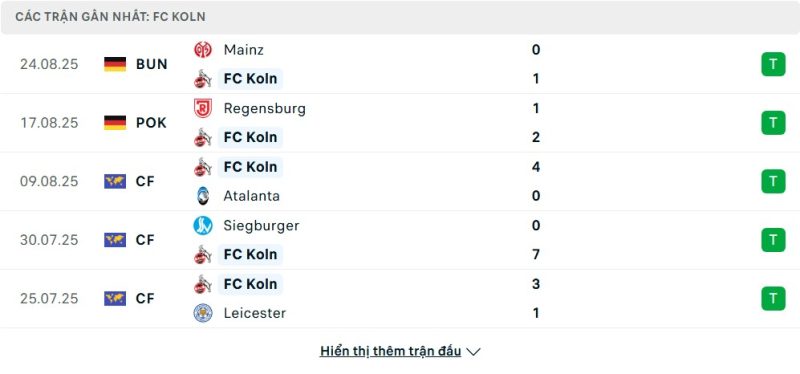 5 trận gần nhất của Köln: W-W-W-W-W