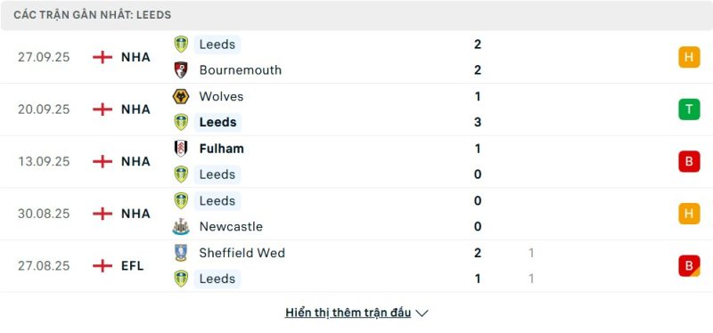 5 trận gần nhất của Leeds United: D-W-L-D-D