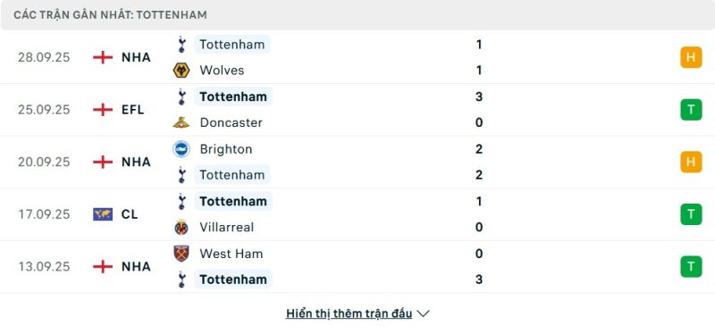 5 trận gần nhất của Tottenham Hotspur: D-W-D-W-W