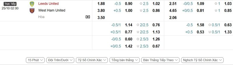 Bảng Tỷ lệ kèo bóng đá Leeds United vs West Ham United