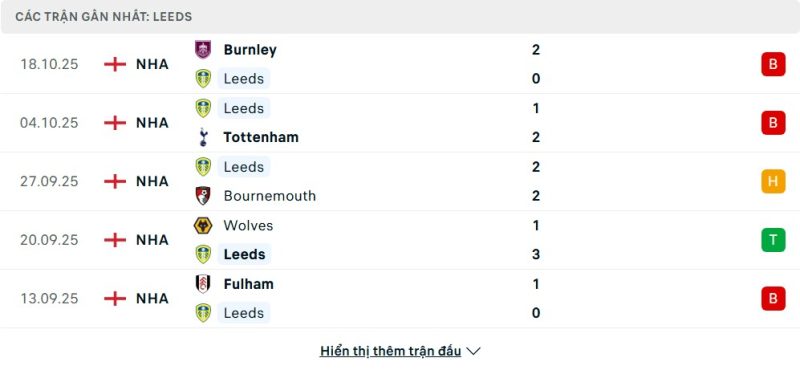 5 trận gần nhất của Leeds United: L-L-D-W-L