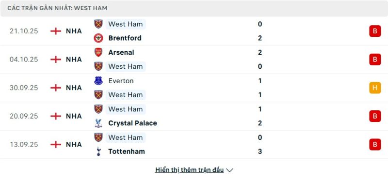 5 trận gần nhất của West Ham United: L-L-D-L-L