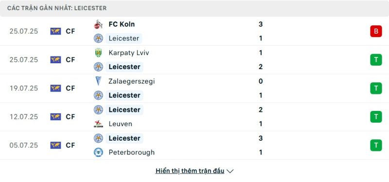 Leicester City khép lại giai đoạn giao hữu với nhiều tín hiệu tích cực. Họ thắng Karpaty Lviv 2-1, Zalaegerszegi 1-0, Leuven 2-1 và Peterborough 3-1, cho thấy khả năng tấn công ổn định và hàng thủ khá chắc chắn. Dù thất bại 1-3 trước FC Koln cho thấy vẫn còn những điểm yếu trước đối thủ mạnh, nhưng nhìn chung Leicester đã có sự chuẩn bị tốt cho mùa giải mới. Mùa trước, đội bóng này cũng thể hiện phong độ sân nhà ấn tượng khi thường xuyên giành trọn 3 điểm.