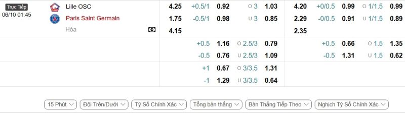 Bảng Tỷ lệ kèo bóng đá Lille vs Paris Saint-Germain