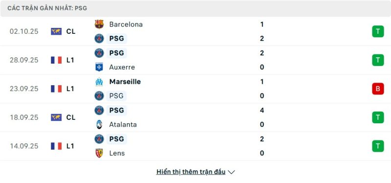 5 trận gần nhất của Paris Saint-Germain: W-W-L-W-W